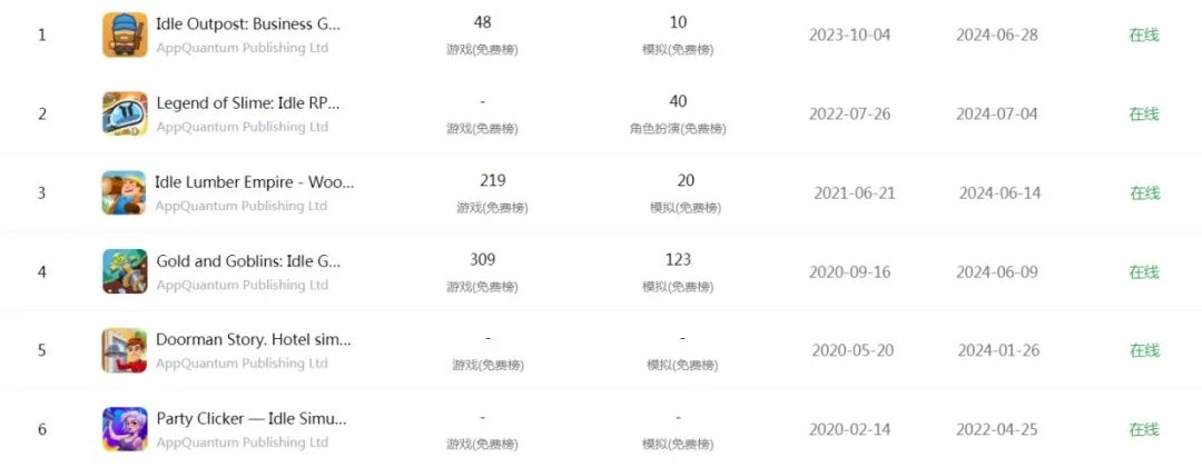 查询游戏发行厂商 AppQuantum 的相关信息可以发现,该厂商来自塞浦路斯,在 2017 年成立,目前员工总数在 200 人左右,但在 2021 年已经得到休闲游戏大厂 Playrix 的投资。点点数据的信息显示,从 2018 年至今公司目前还在运营的产品有 9 款,除了「Legend of Slime」之外都是放置游戏。