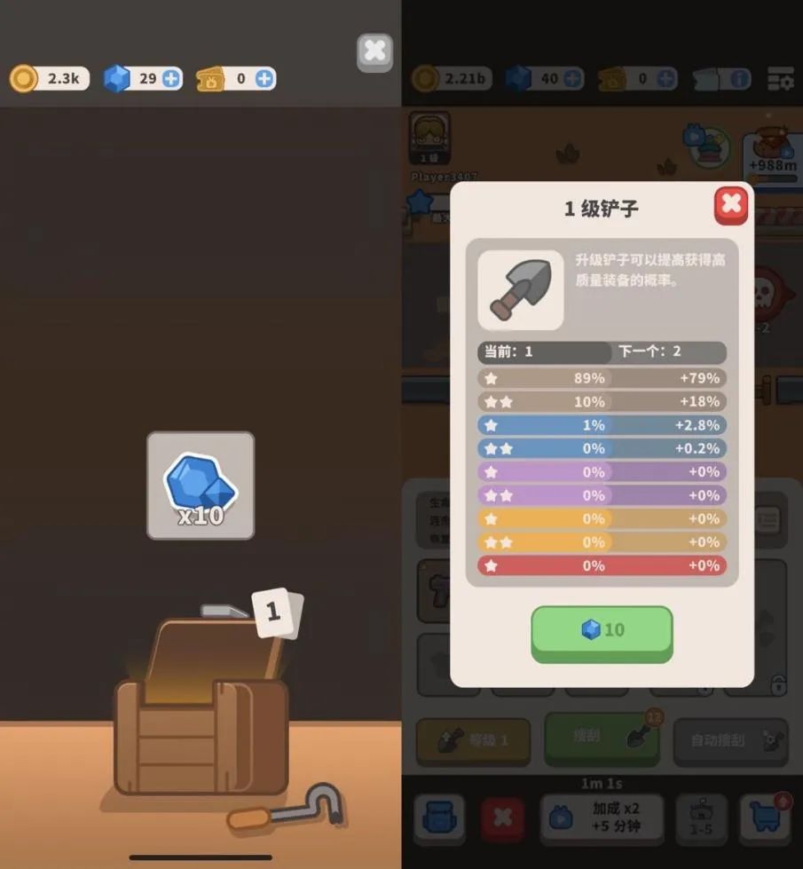 通过对铲子划分级别(级别越高开出的战斗装备越好、战胜 Boss 的概率越大)并与钻石挂钩,「Idle Outpost」给了玩家一个很强的内购理由 |图片来源:Idle Outpost