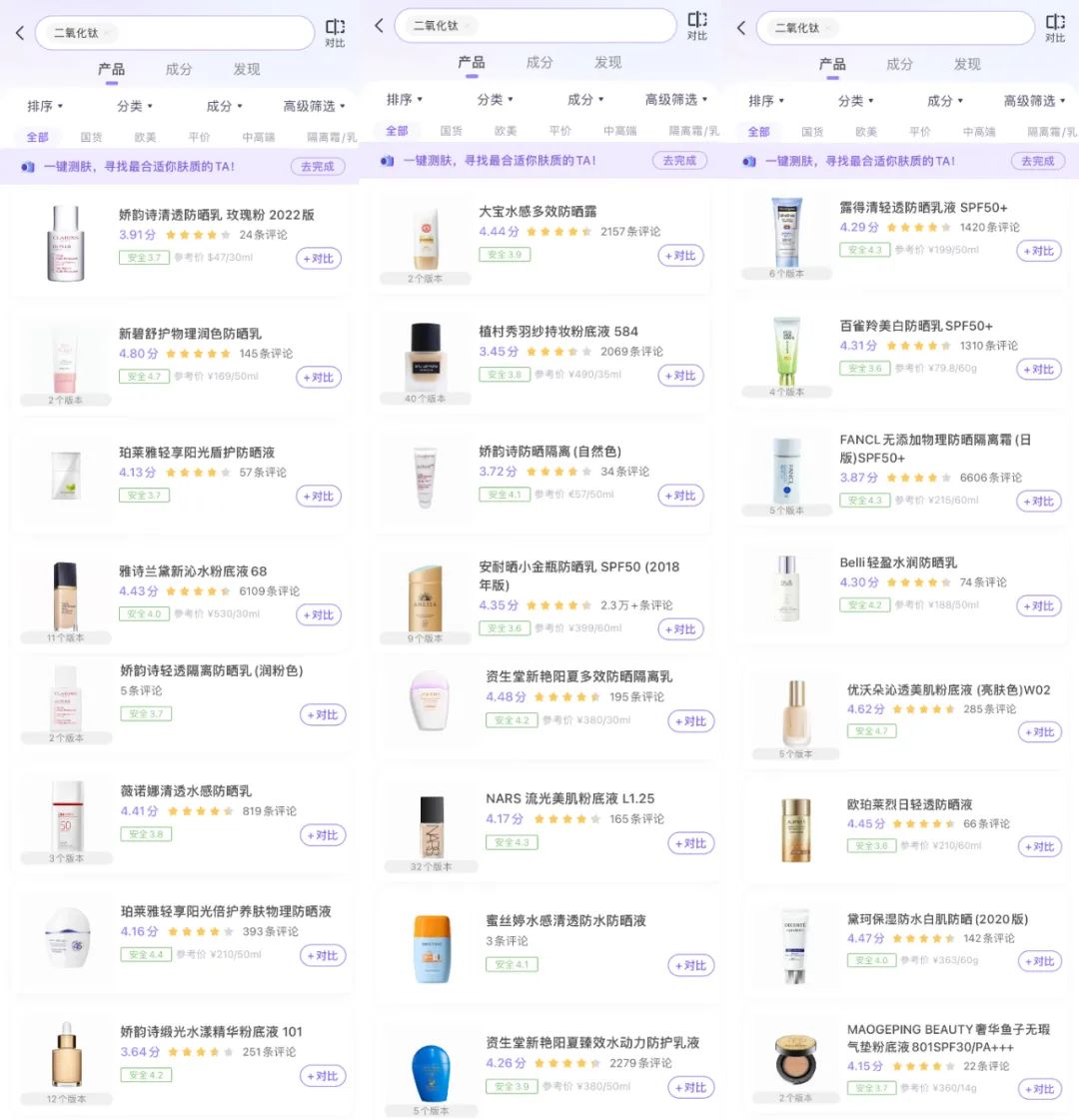 诸如雅诗兰黛、资生堂、珀莱雅、毛戈平、彩棠等国内外多个知名化妆品牌的产品中均有二氧化钛作为物理防晒的添加成分。