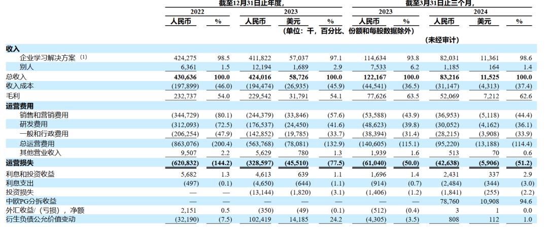 2022年、2023年及2024年前三个月,云学堂的收入分别为4.31亿、4.24亿和 0.83亿元,净利润分别为-6.15亿、-2.20亿及 0.35亿元人民币。尽管营收有所滑坡,但其亏损程度却在改善,在今年第一季度,云学堂开始扭亏为盈。
