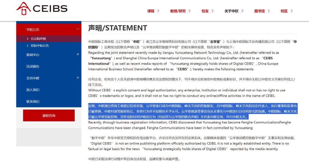 但两个月后,中欧国际工商学院官网却发布公告称,中欧对该等股权转让、变更行为并不知情也不予认可。云学堂就该等事宜也从未事先与中欧进行过任何形式的沟通。中欧国际、峰禾文化已被云学堂实际控制,其作出的任何声明及行为(包括其与云学堂的联合声明)不代表中欧立场,均与中欧无关。“数字中欧”也并非中欧官方授权的在线出版平台,亦非任何合法存在的法律实体。