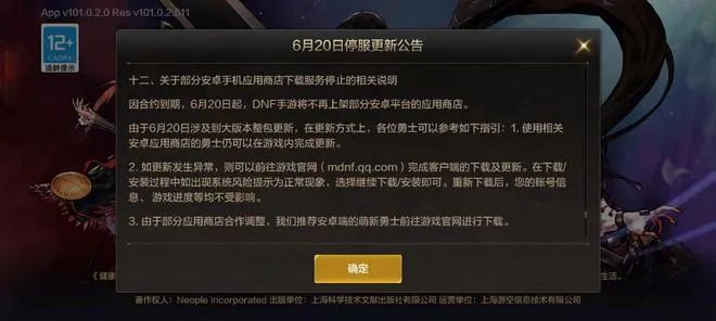 6月19日,腾讯旗下手游《地下城与勇士:起源》官方公告显示,因合约期满,自6月20日起,该游戏将不再上架部分安卓平台的应用商店。