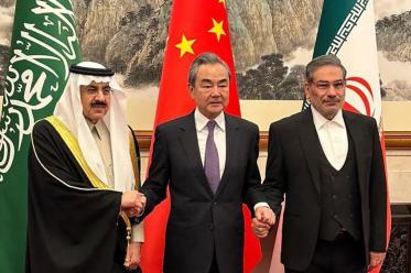 2023年3月10日,中国、沙特、伊朗在北京发表三方联合声明,宣布沙特和伊朗将恢复双方外交关系。