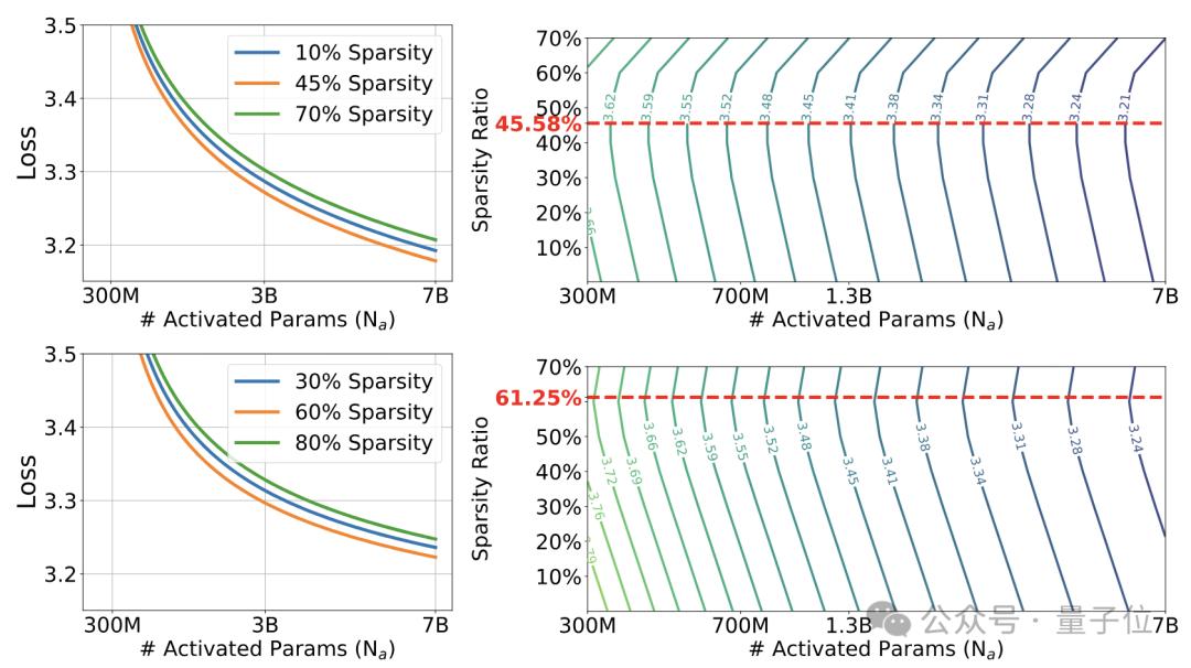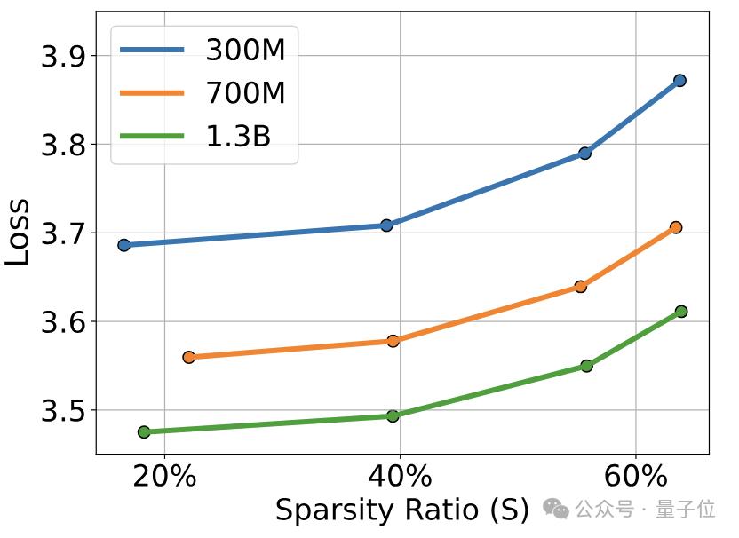 这个缩放定律表明,稀疏激活模型的性能随着模型规模的增大而提高,但提高的速度会逐渐变慢。