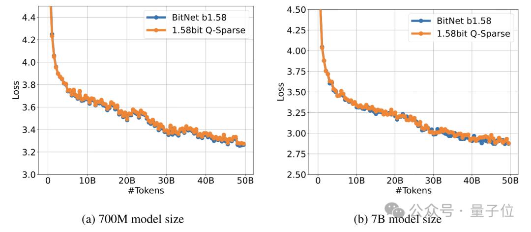 可以看到,在700M和7B两种规模下,使用Q-Sparse的量化模型的收敛速度和最终损失函数值与未使用Q-Sparse的量化模型(BitNet b1.58)相当。
