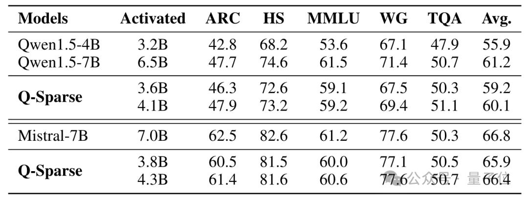 对比实验表明,无论是稀疏率还是模型表现,Q-Sparse都显著优于此前的ReLU方法。