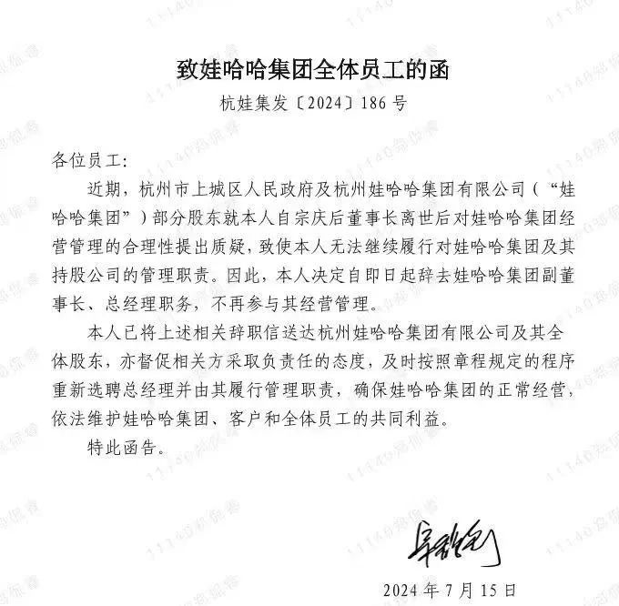 近日,一则名为《致娃哈哈集团全体员工的函》在网络流传,该函发布日期为7月15日,落款人为宗馥莉。函件内容显示,因杭州市上城区人民政府及杭州娃哈哈集团有限公司(下称“娃哈哈集团”)部分股东就其自宗庆后离世后对集团经营管理的合理性提出质疑。因此,宗馥莉决定自即日起辞去娃哈哈集团副董事长、总经理职务,不再参与集团经营管理。