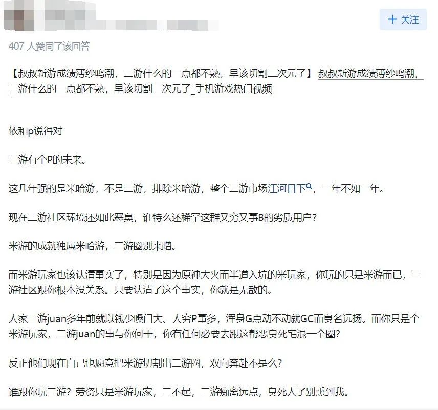 “二游有个p的未来,这几年强的是米哈游,不是二游!”