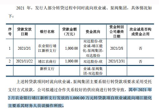 另外,在转贷业务的实际操作过程中,还发生了一件有趣的事情。双达股份拟通过合作关系较好的供应商进行转贷,其中 2021 年2 月农业银行靖江新桥支行发放的 1000万元转贷款项自欣业诚流向靖江能化,但问题是靖江能化当时已经退出了与双达股份的业务合作。对于该事件的原因,双达股份表示,主要系财务人员误操作所致。