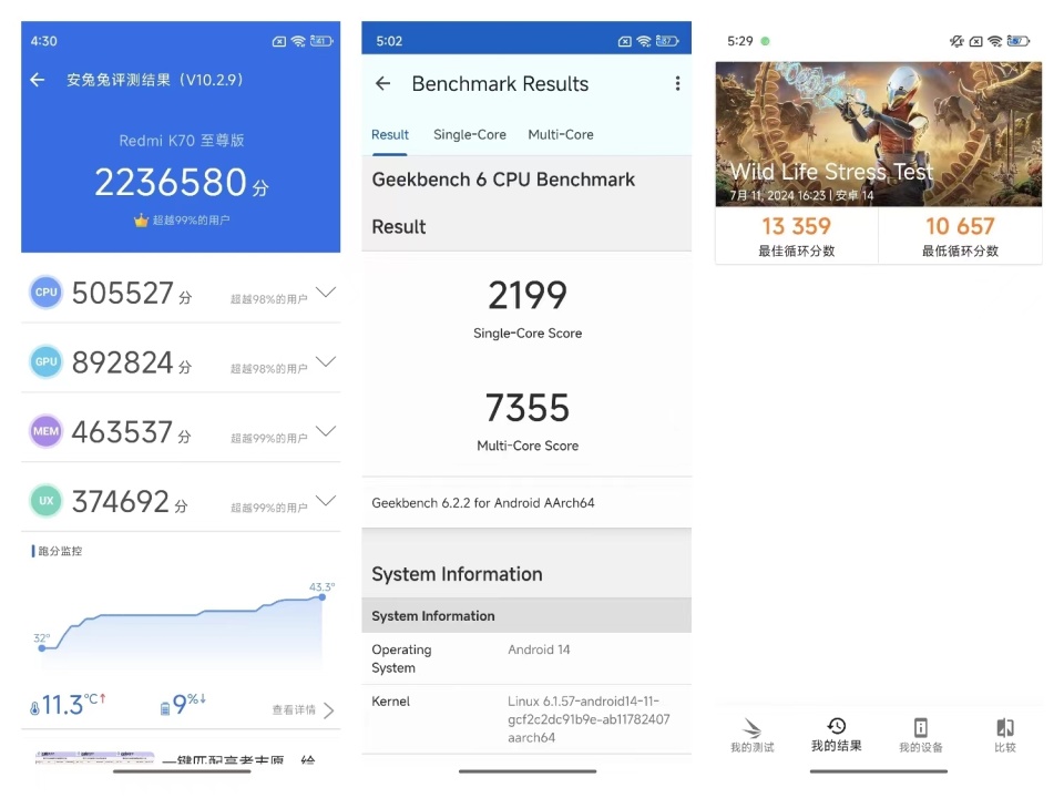 从跑分来看,K70至尊版安兔兔评测实际得分达到220万分,GeekBench6 单核2199、多核7355分,属于安卓阵营的第一梯队。值得注意的是,虽然K70至尊版的跑分并没有一骑绝尘,但机身温度控制相当不错,即便是在3D Mark的Wild Life Stress Test 20次循环中也没有出现过热的情况。