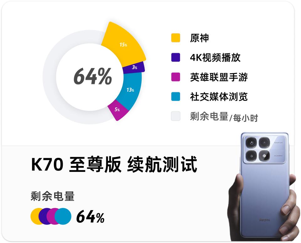 除了性能之外,Redmi K70至尊版还配备了5500毫安时大容量电池和120W快充,内置载自研快充芯片澎湃 P2 与自研电源管理芯片澎湃 G1。实测在4小时通用续航模型中剩余64%,成绩相当亮眼。