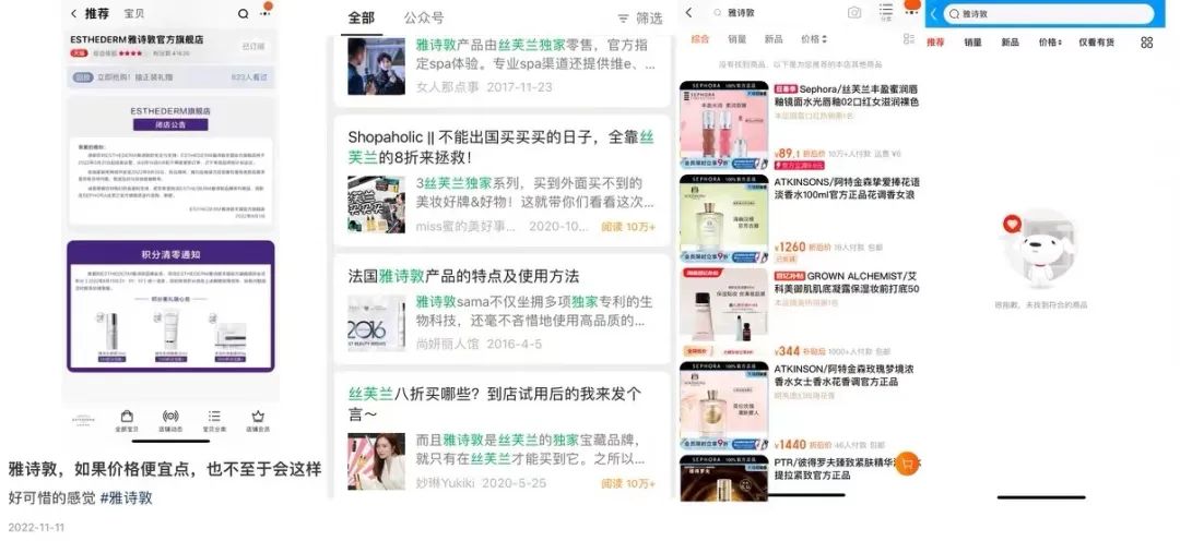 针对此事,聚美丽记者求证后发现,雅诗敦曾被有关媒体报道称,该品牌独家入驻丝芙兰。不过,早在2022年9月天猫官方旗舰店便已闭店,且目前京东、天猫丝芙兰官方旗舰店中都未搜索到雅诗敦产品。