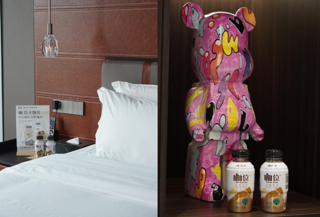“咖位”是娃哈哈在2023年重磅推出的咖啡产品,在“咖位主题房”中,娃哈哈精心设计了一系列与咖啡文化紧密相关的元素。房间内的照片墙、抱枕等装饰均以“咖位”为主题,营造出一种浓厚的咖啡氛围。更令人惊喜的是,每位入住的消费者都将免费获得一杯咖位拿铁,让咖啡的香气与房间的温馨完美融合,为咖啡爱好者带来一场难忘的沉浸式体验。