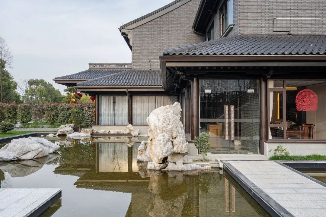 酒店自身建筑风格是徽派的灰瓦白墙,水景、树木、小溪、泳池等将酒店环绕,据说,置身其中会认为自己是在湘湖的某个景点。