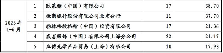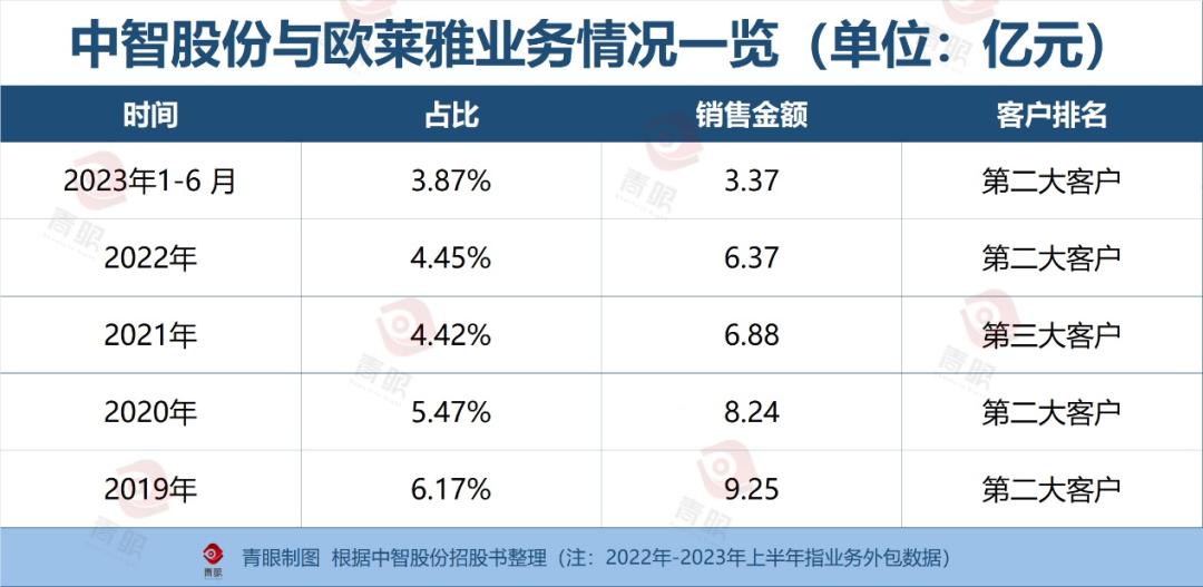 2019年至2023年上半年,雅诗兰黛持续位居中智股份第一大客户,占比分别为6.57%、6.62%、7.8%、9.41%、8.23%,总销售金额近50亿元;欧莱雅则紧随其后,长期位居第二、第三大客户,为中智股份创收达34.11亿元。