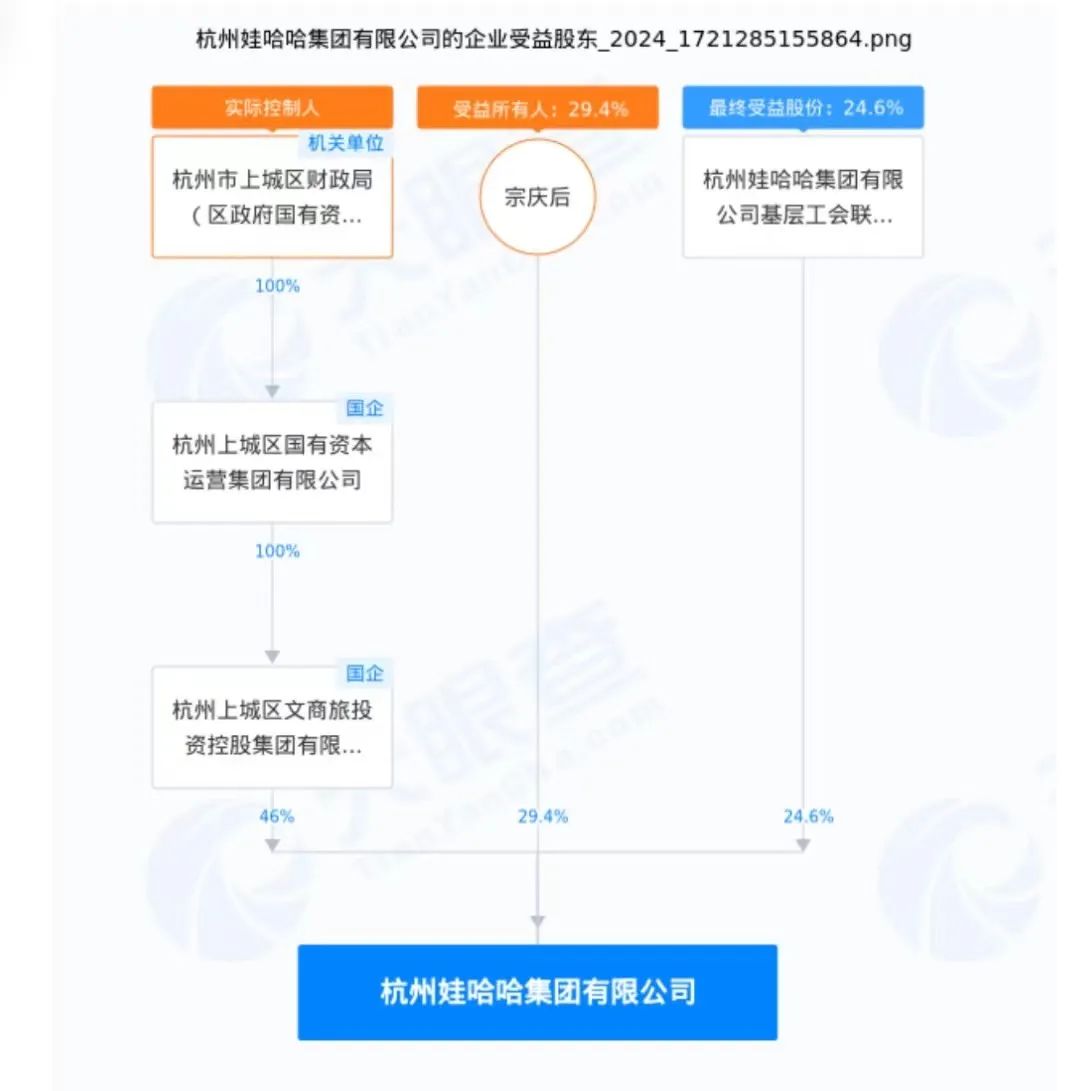 根据天眼查的数据,杭州娃哈哈集团的最大股东实际上是一家国企,杭州上城区文商旅投资控股集团有限公司(简称“上城文商旅控股”),其持股比例高达46%。这家公司由上城区财政局、上城区国资委、上城区国有资本运营公司全资控股。