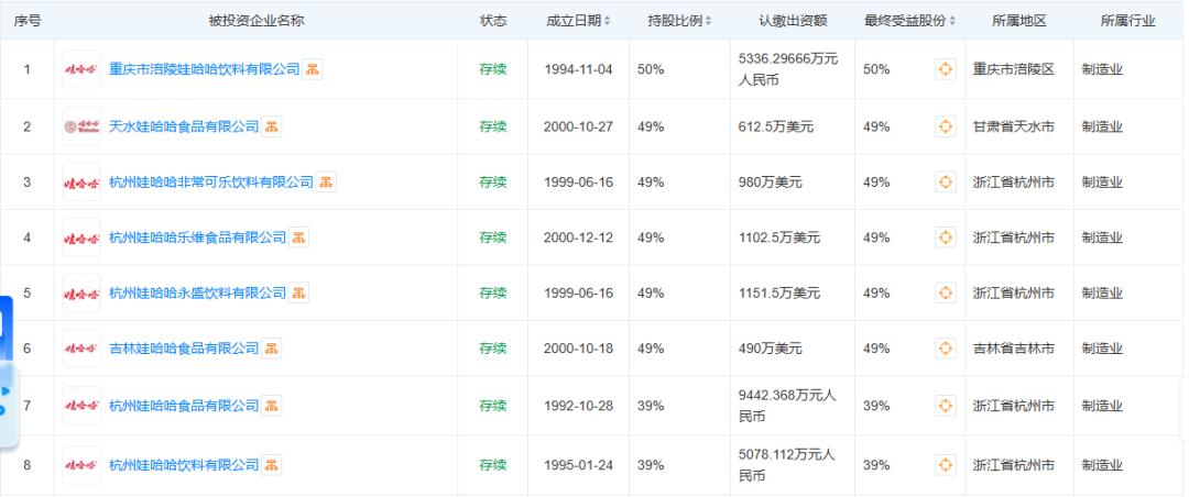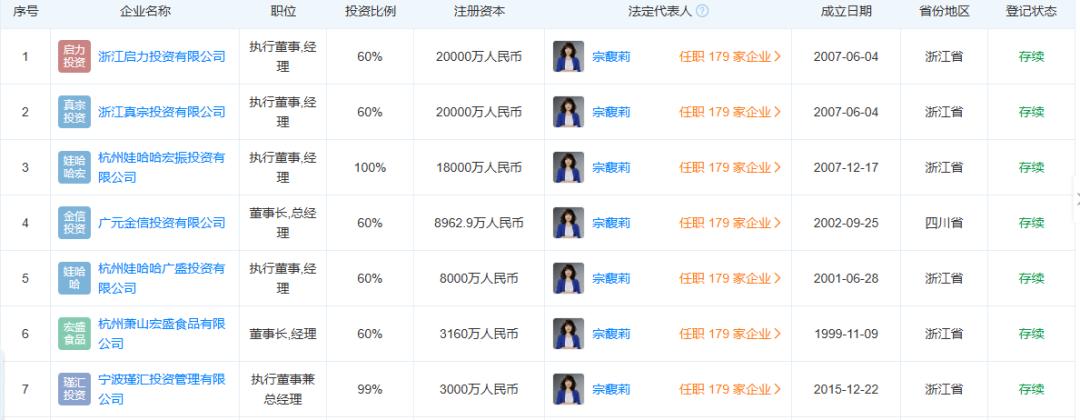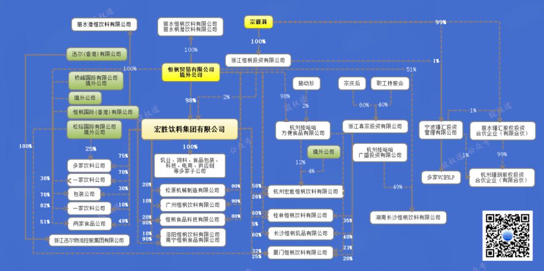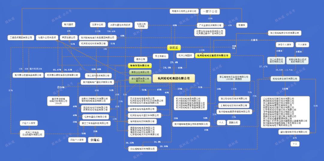 一方面,宗庆后个人通过杭州娃哈哈宏振投资有限公司等多个主体,在娃哈哈体系内,持有大量公司;而宗馥莉,同样通过持有宏胜饮料等主体在娃哈哈体系内有大量业务布局。