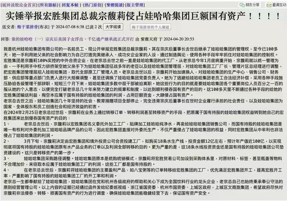 举报信中详细列举了宗馥莉排挤架空原有管理层、重点部门负责人进行大规模调整、输送宏胜集团、大肆侵占国有资产、通过宏胜集团直接对外委托生产、和境外投资公司合资投建工厂、调整采购路径等情况,但举报信的真实性未知。