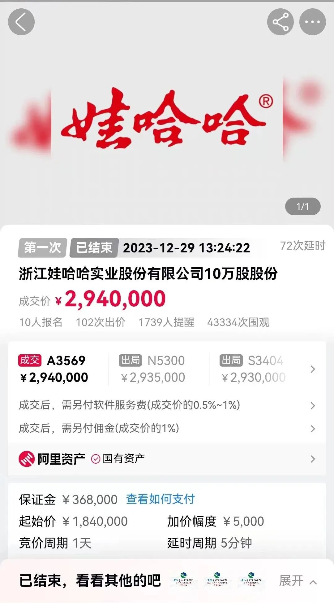 由内部职工持股约31%的浙江娃哈哈实业股份有限公司,在近半年多来,出现了多次自然人股东的股权拍卖。《每日经济新闻》记者注意到,在阿里拍卖平台上,2023年12月至今,该公司的自然人股份出现近50次拍卖,从5000股到10万股不等,价格从几万元到几百万元不等。