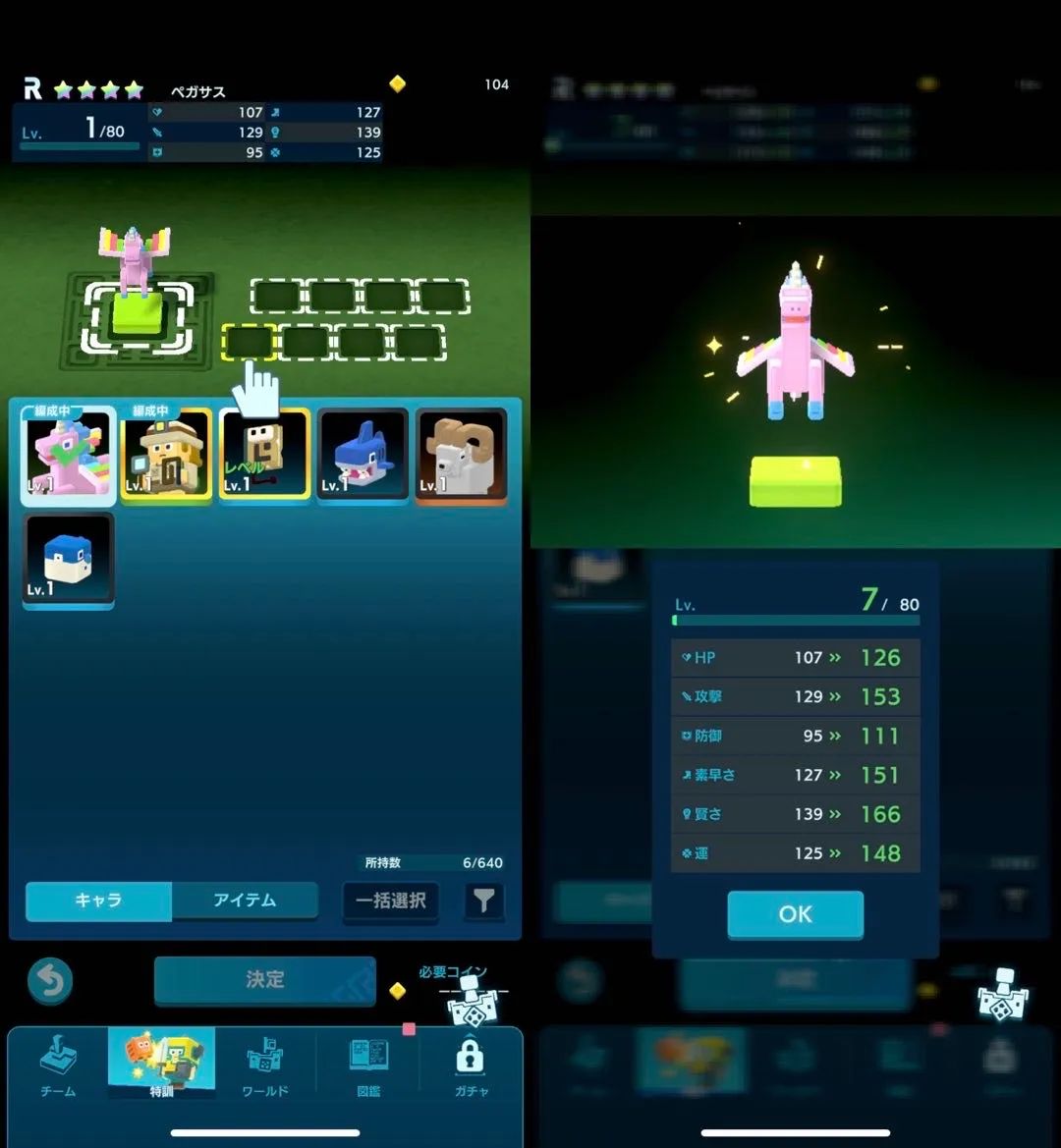 队员和装备也有强化系统,强化方法则是和低等级的队员和装备合成。这也给了玩家进行 RPG 探险的更多动力,不会浪费数值较低的队员和装备。操作同样直观,只要拖拽到合成栏位就能完成强化。