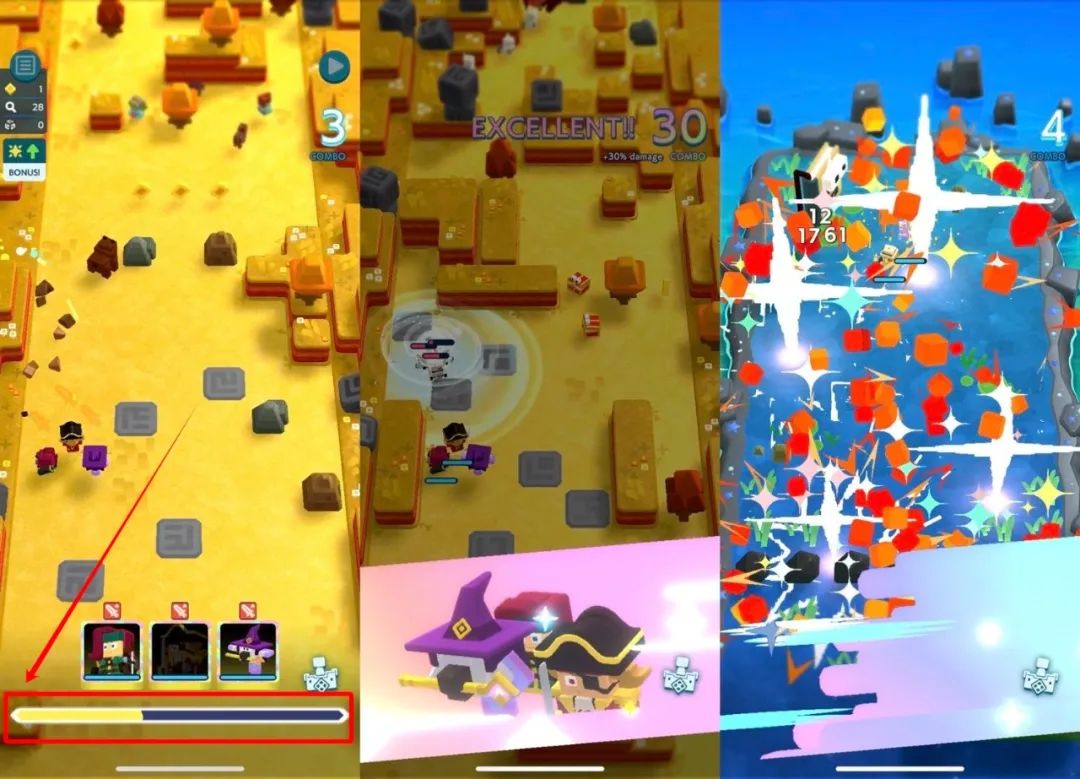 团队必杀技进度条在屏幕最下方(图左 1 红框圈出),满蓄力之后就能释放出非常华丽的“清场”进攻效果 | 图片来源:PANDOLAND