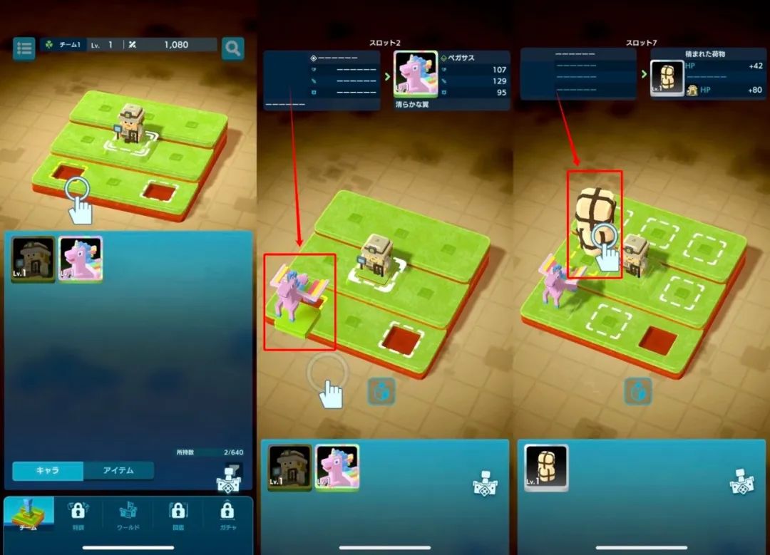 「PANDOLAND」的组队系统以九宫格的形式呈现,其中队员栏位是凹槽(中图红框圈出),装备栏位是方格(右图红框圈出) | 图片来源:PANDOLAND