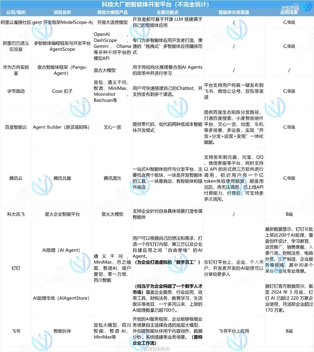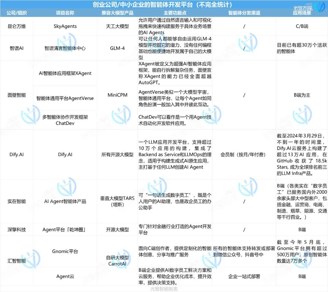 在光锥智能不完全统计中,除互联网大厂百度、字节跳动和腾讯的智能体开发平台,支持所有开发者进行智能体开发外,其他绝大多数是面向B端企业,做企业智能体开发和服务。