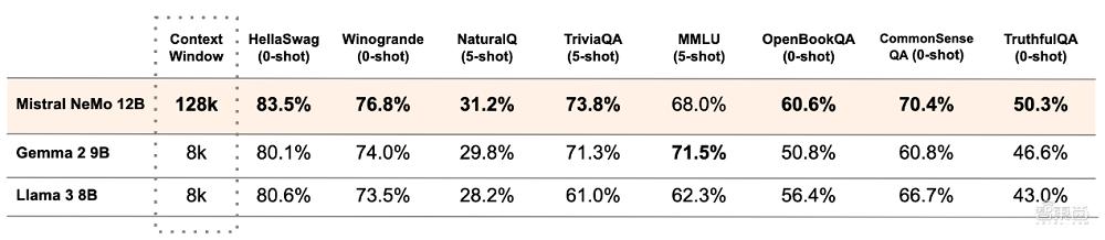 Mistral NeMo 12B与Gemma 2 9B和Llama 3 8B在基准测试中的表现(图源:Mistral)