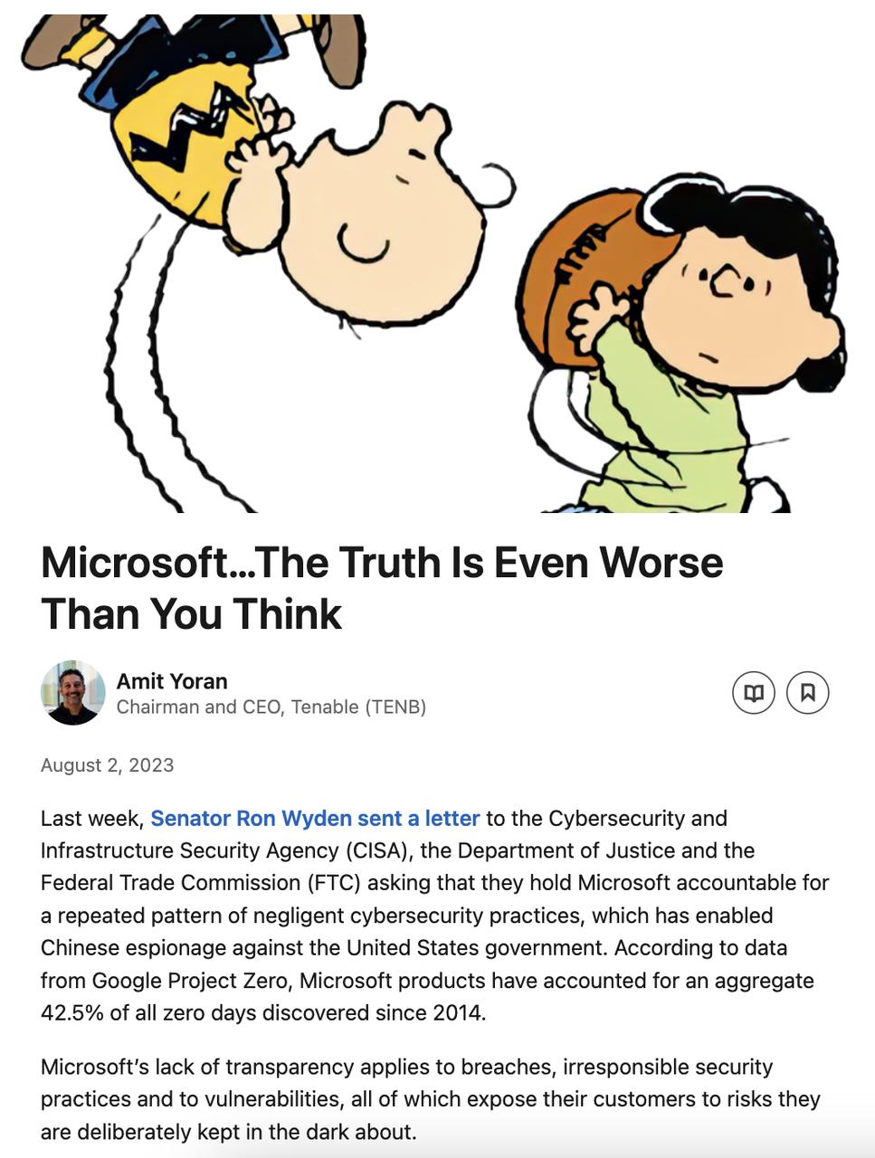 网络安全公司 Tenable 的首席执行官 Amit Yoran 直接在社媒上发文开怼称,微软的网络安全问题「比你想象的还要糟糕」。他透露自己的公司曾发现微软 Azure 的另一个漏洞,可能导致敏感数据泄露,在立即通知微软后,微软花了「超过 90 天的时间才实施了部分修复」。