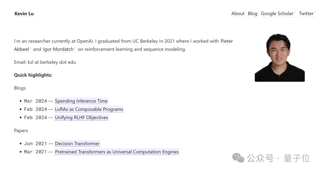 Kevin Lu,自述最近刚加入OpenAI。2021年毕业于加州大学伯克利分校,就读期间受伯克利人工智能研究所(BAIR)联合主任Pieter Abbeel和谷歌DeepMind研究科学家Igor Mordatch指导,研究方向是强化学习和序列建模。