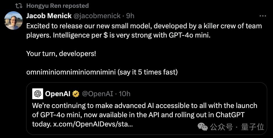 锣鼓喧天的热烈讨论中,GPT-4o mini背后团队也没藏着掖着,都在𝕏上卖力宣传了起来,并不吝对自家“杀手级团队”的自豪。