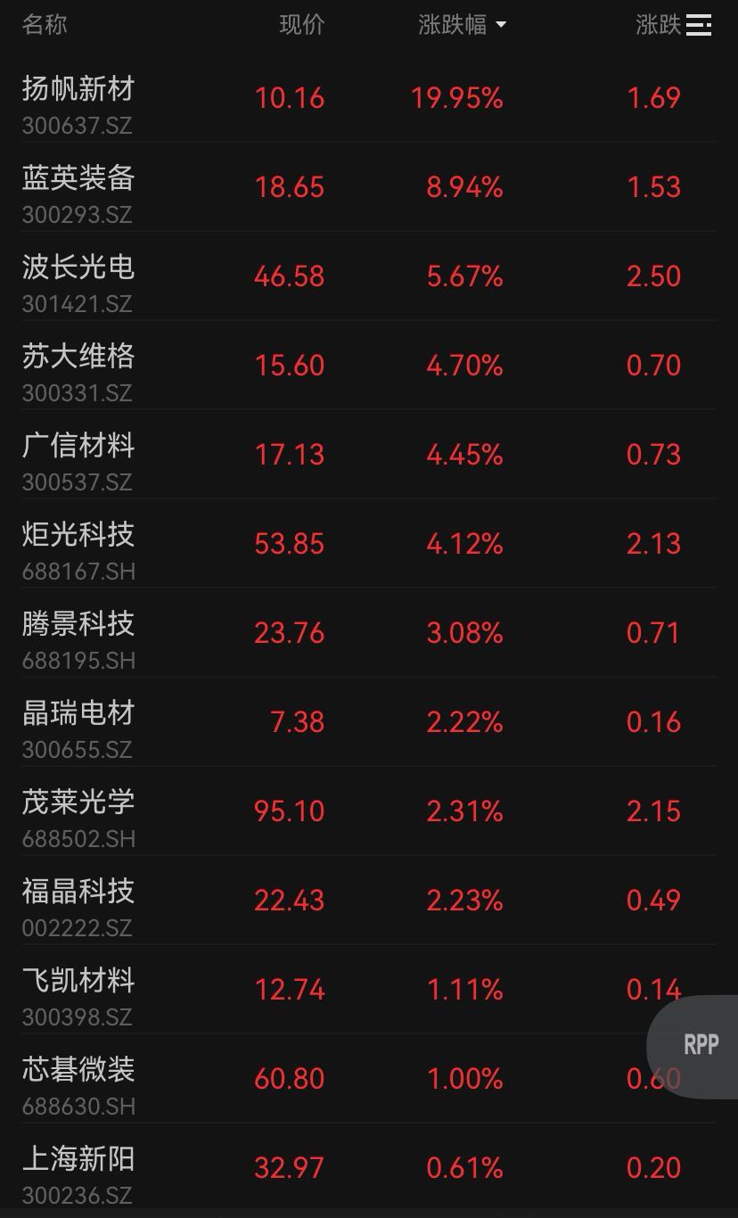 光刻机概念股继续拉升,扬帆新材双双涨停,蓝英装备、东方嘉盛涨超8%,波长光电、苏大维格、泰晶科技等跟涨。