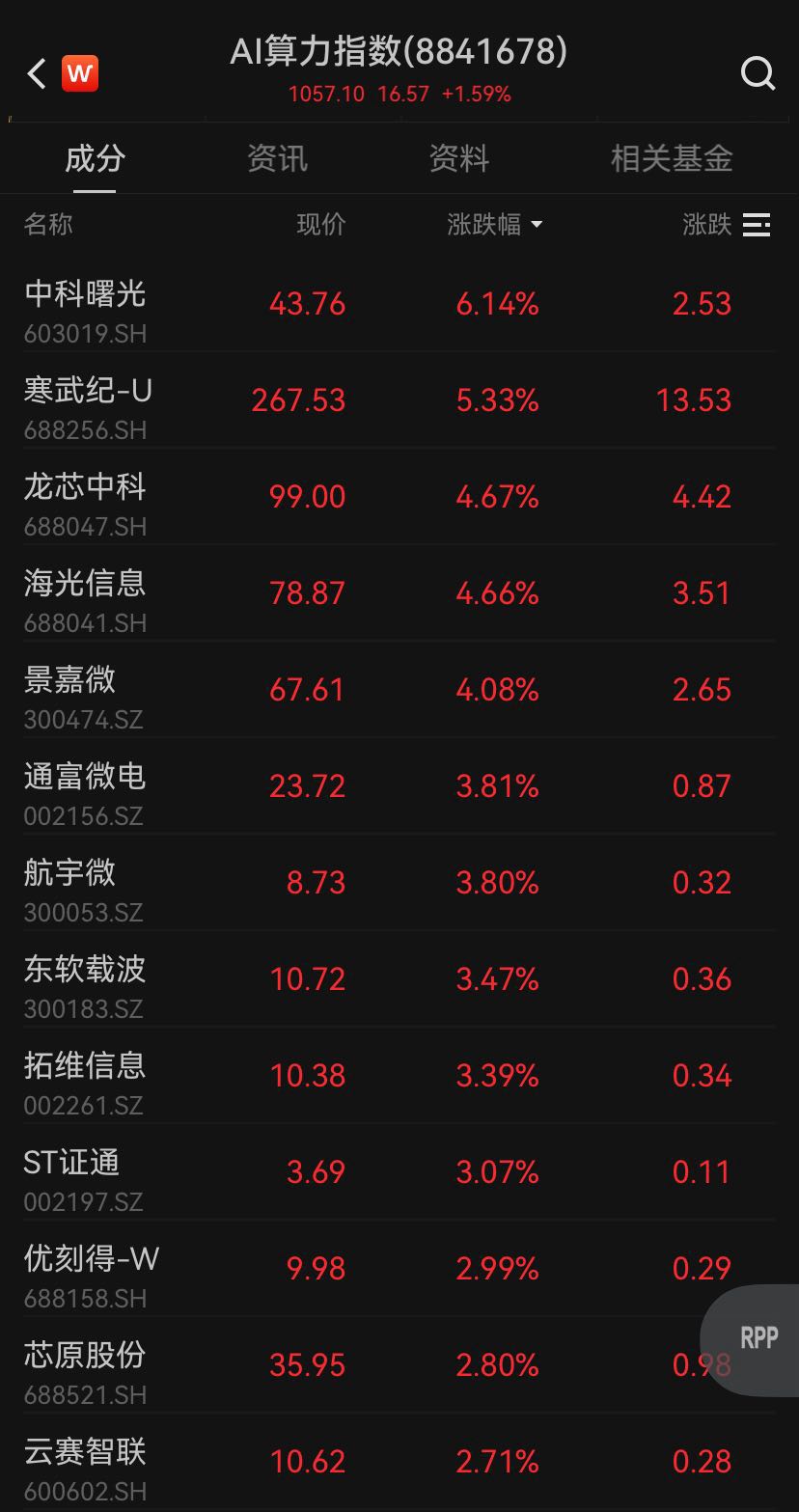 算力概念股震荡拉升,高新发展涨超8%,中科曙光涨逾6%,寒武纪、海光信息、云天励飞、软通动力等涨幅居前。