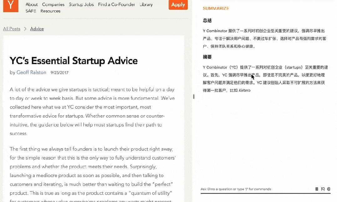 Elmo即插即用,能快速生成总结、摘要,以及亮点。