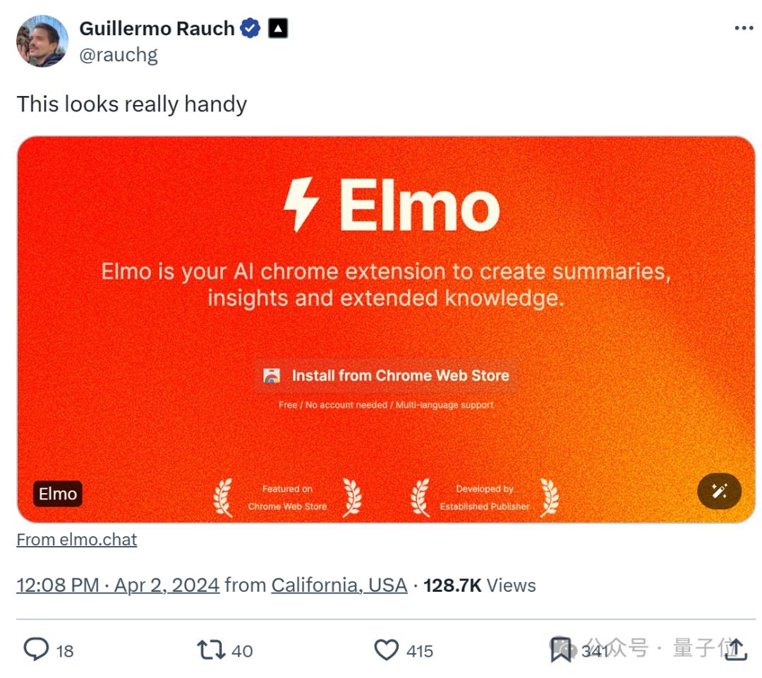 chrome插件地址:https://chromewebstore.google.com/detail/elmo-chat-your-ai-web-cop/ipnlcfhfdicbfbchfoihipknbaeenenm安装步骤:https://x.com/yadong_xie/status/1813773179388846100参考链接:[1]https://x.com/yadong_xie/status/1813562437125452134[2]https://x.com/yadong_xie/status/1808334735674094075