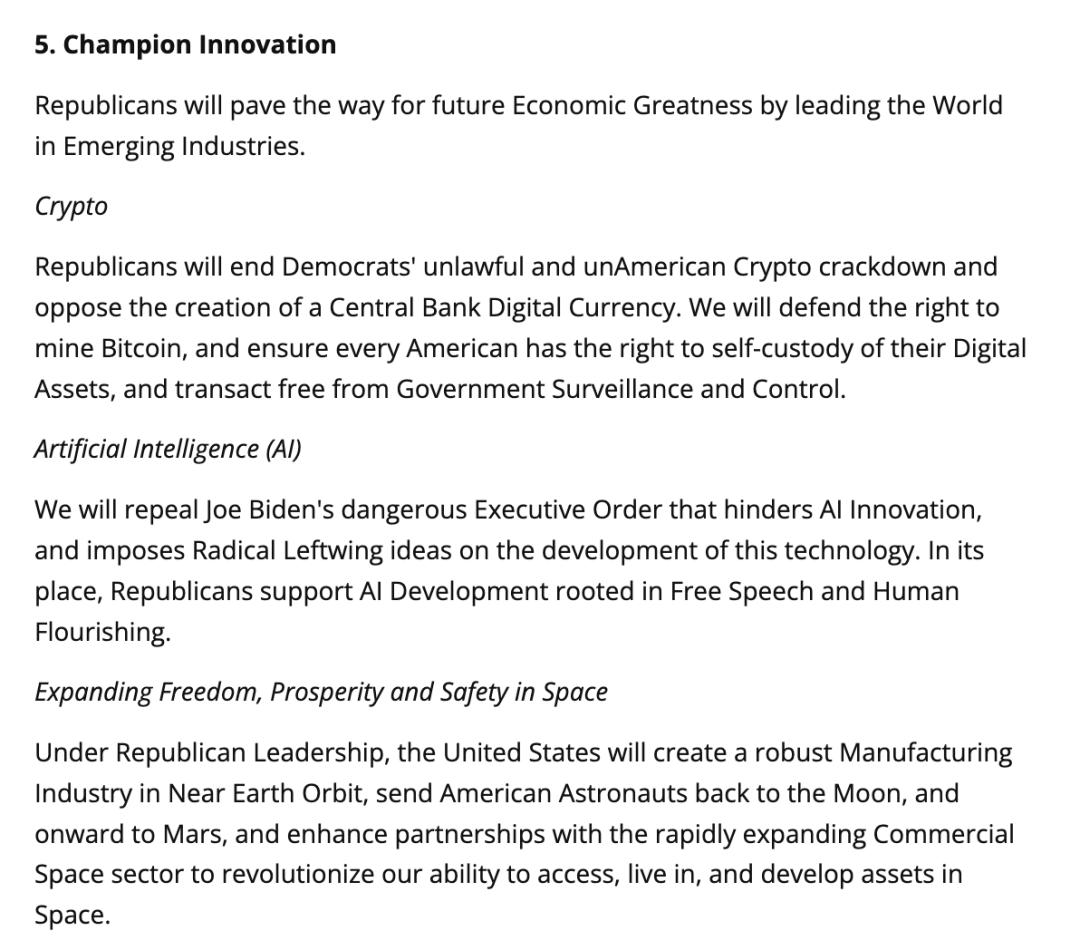 “共和党人将结束民主党对加密货币的打压,并捍卫开采比特币的权利,确保美国人都有权自我保管其数字资产,并在不受监视和控制的情况下进行交易。”