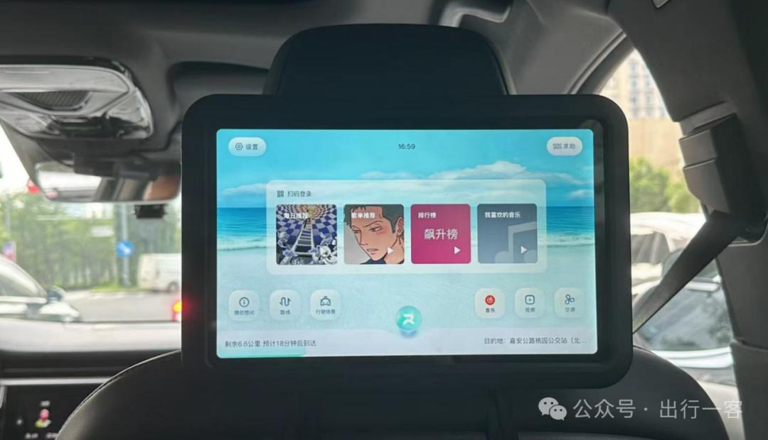 前排座椅后方均绑有触摸屏,乘客可以自由播放音乐、视频、控制车内空调温度,也可以查看路线图及行驶场景。下方进度条显示剩余行程和预计到达时间,如遇突发事件可以点右上角“SOS”求助按钮。
