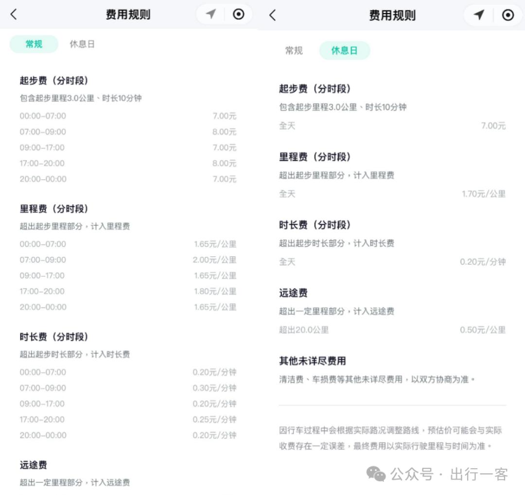 萝卜快跑和一般网约车的费用结构、收费模式相似。平台显示,费用由“起步费+里程费+时长费+远途费+其他未详尽费用”五个部分组成,其中起步里程3公里、时长10分钟,超出20公里计算远途费,常规和休息日计费有所不同。