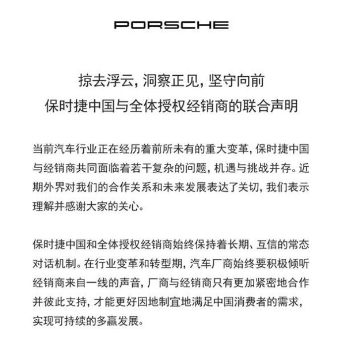 随着价格战的持续,经销商亏损不断加剧,而如果车企不采取措施,很有可能重蹈保时捷经销商“造反"的覆辙。 此前,在曝出授权经销商集体“造反”后,保时捷迅速进行了安抚与处理,并发表了联合声明。