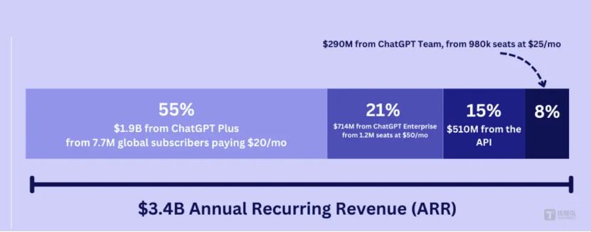 但目前来看,大模型企业的赚钱之路依然漫长。以行业龙头OpenAI为例,在今年前六个月,其年度经常收入增长到了 34 亿美元。据调研机构FutureSearch报告显示,ChatGPT会员付费收入占50%以上,偏向企业和开发者端的API收入占比仅为15%左右。