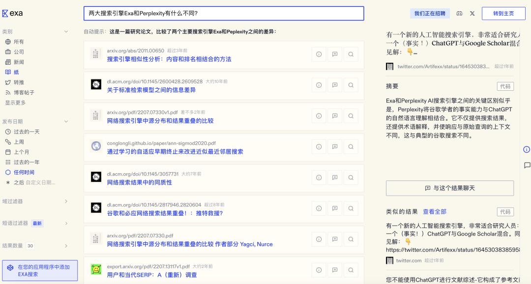 我搜的第一个问题是:Exa和Perplexity有什么不同?