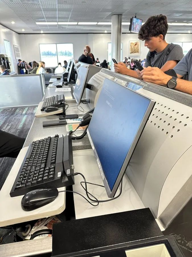 美国的机场中,旅客和工作人员发现自己无法办理登机手续,只能坐在候机厅里眼巴巴地望着窗外的飞机。