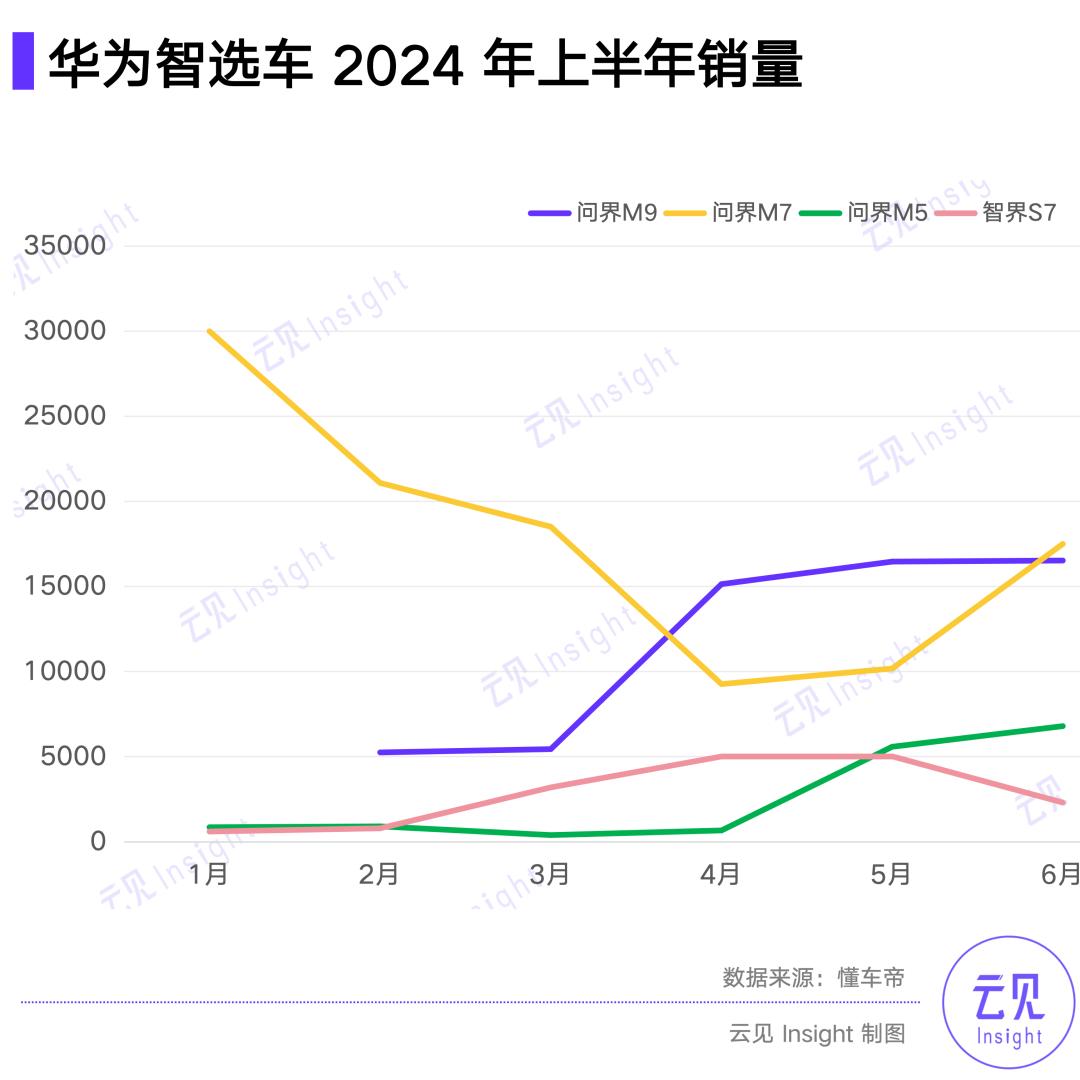 智选车问界大卖,让车 BU 不仅提前扭亏,还实现了半年度盈利。根据懂车帝的数据,问界今年上半年累计销售了约 18.1 万辆车。其中,47 万起售的问界 M9 销售了约 5.9 万辆,25 万起售的问界 M7 销售了约 10.7 万辆。
