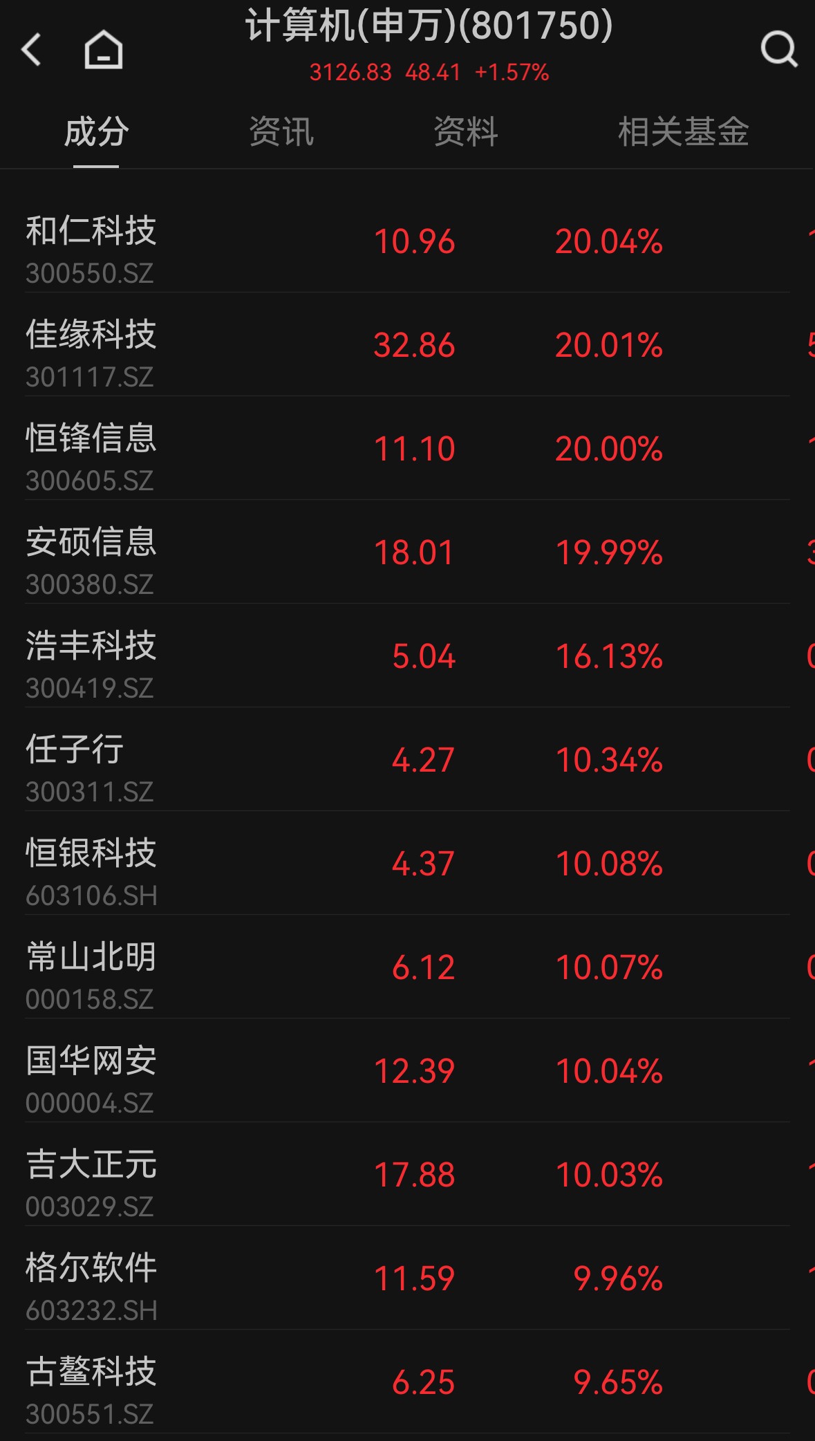 网络安全、国产软件板块领涨,和仁科技、佳缘科技、恒锋信息、安硕信息20%涨停,恒银科技、常山北明、国华网安、吉大正元、格尔软件等封板。