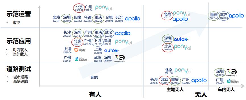 技术迭代方面,虽然每家自动驾驶公司进度不一,但大致都是按照【封闭道路测试】→【公开道路测试(城市/高快速路)】→【示范应用】→【示范运营】这个进阶顺序来对车辆的无人驾驶功能进行反复测试验证的,每个大环节里,再以【有人】和【无人】状态进行细分。