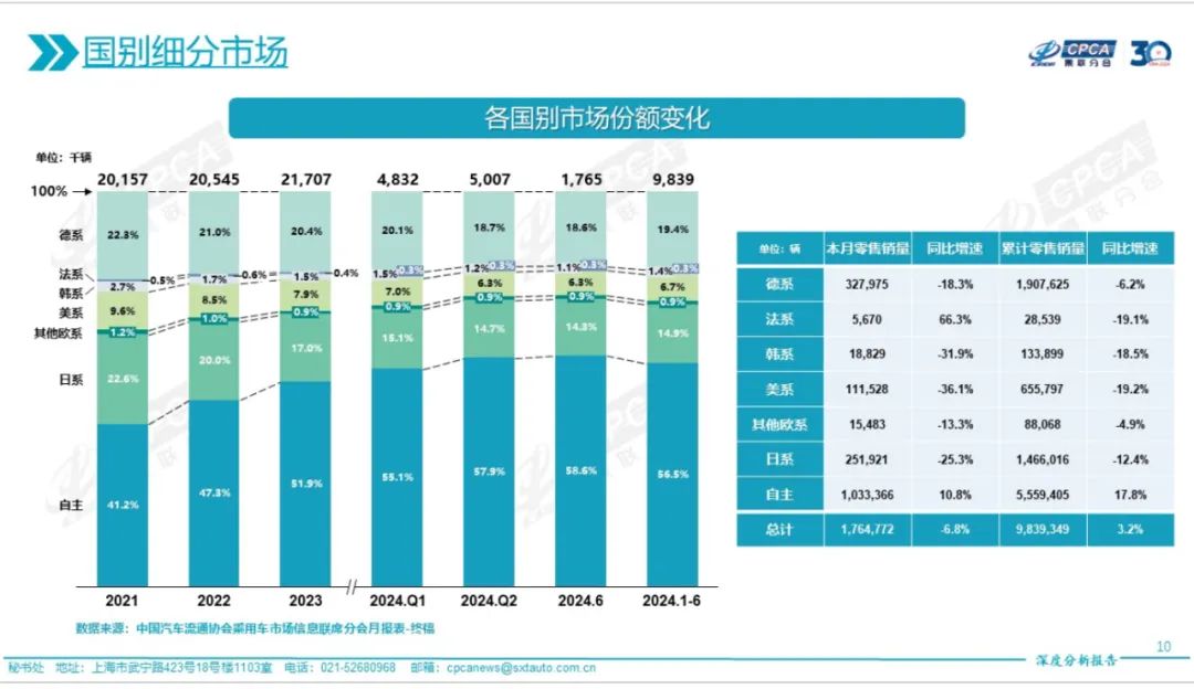 乘联会的最新销量数据显示,今年上半年,德系品牌市场份额从去年的20.4%下滑至在19.4%,日系品牌市场份额从17%下滑至14.9%,美系品牌市场份额从7.9%下滑至6.7%。反观自主品牌,其市场份额已经从去年年底的51.9%增长至今年上半年的56.5%。