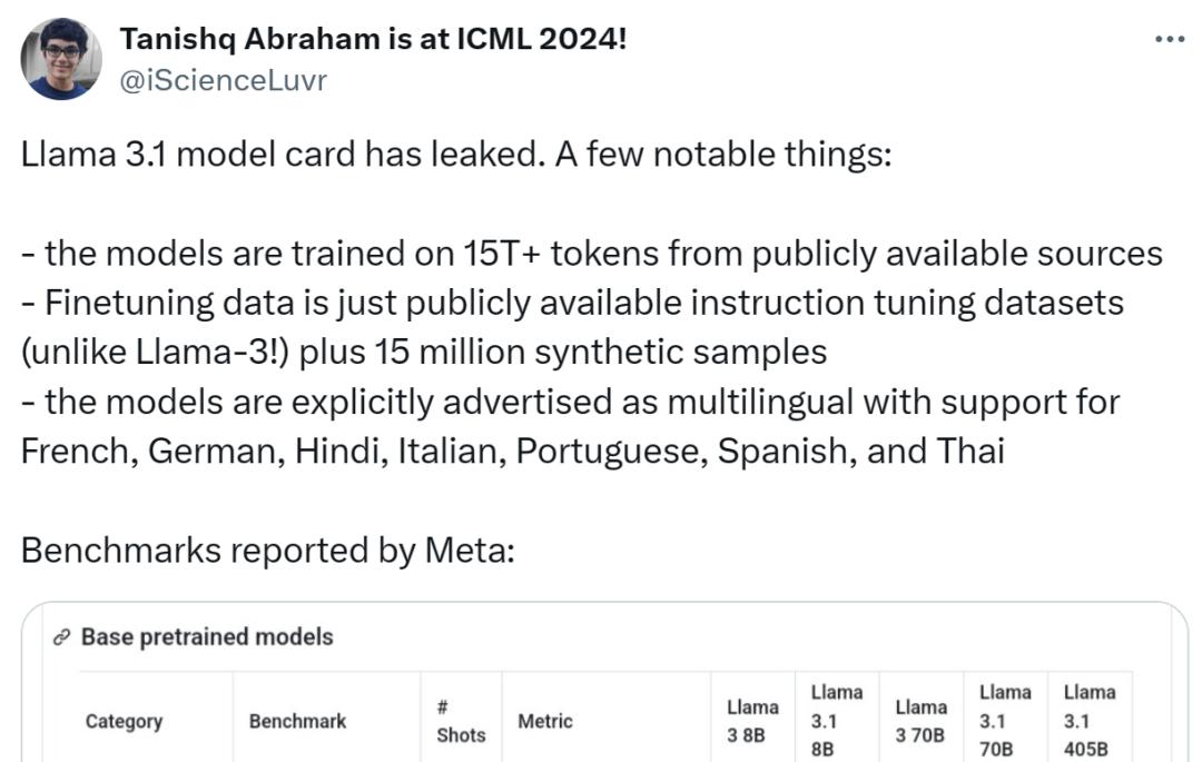 与此同时,Llama 3.1 的模型卡流出,细节也泄露了(从模型卡中标注的日期看出基于 7 月 23 日发布)。