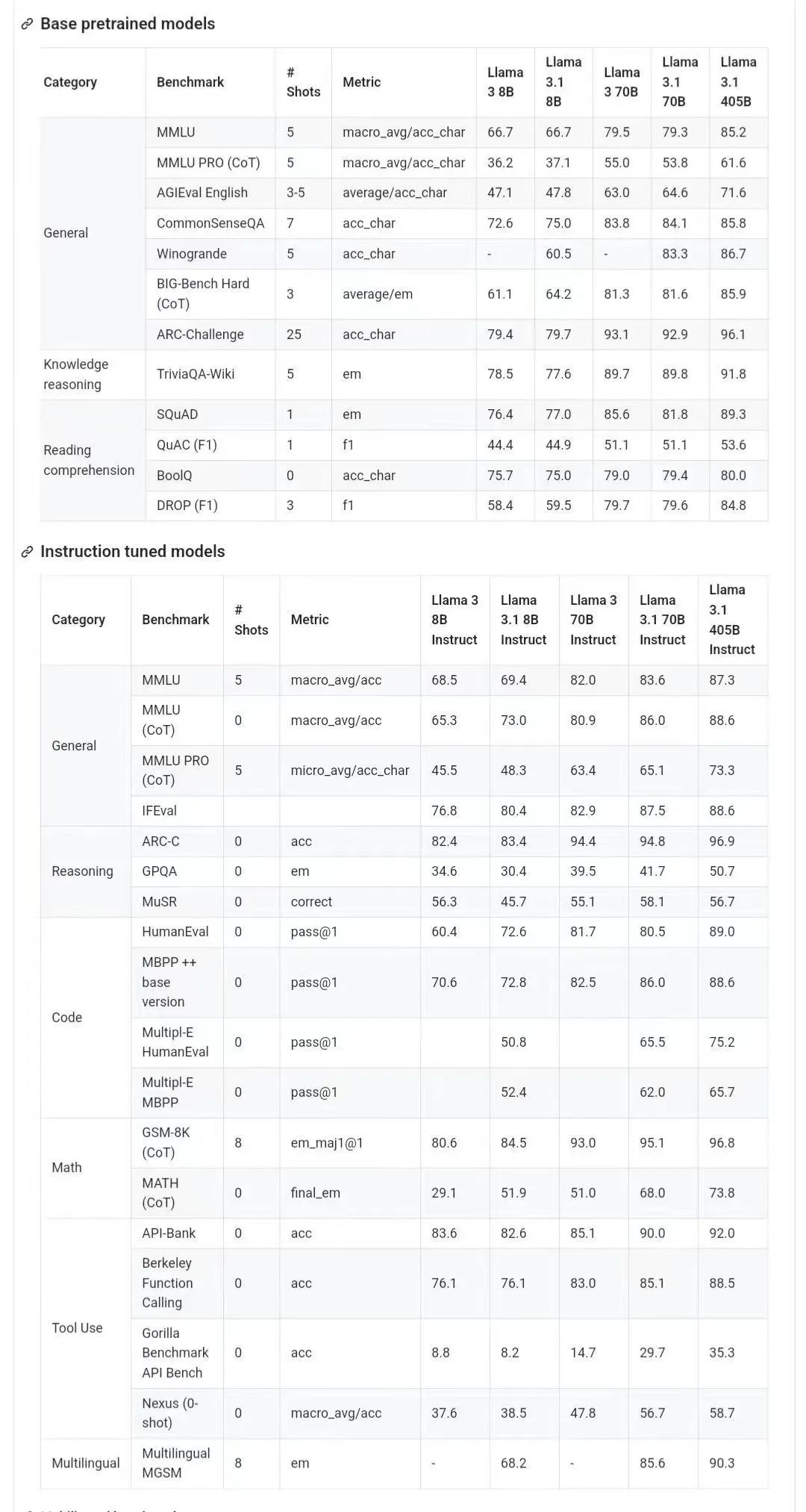 显然,3.1 版本的 8B 和 70B 模型是由 405B 蒸馏得来的,因此相比上一代有着明显的性能提升。