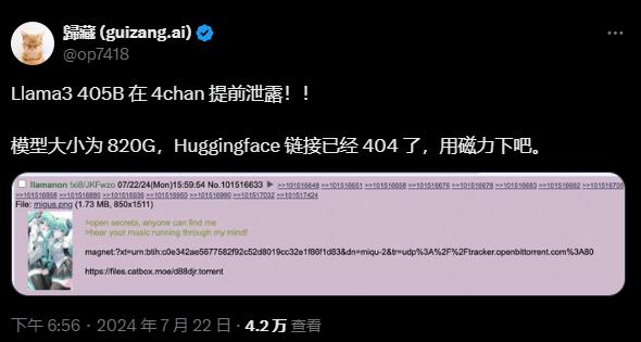 首个超越GPT4o级开源模型,Llama 3.1泄密:4050亿参数,下载链接、模型卡都有了