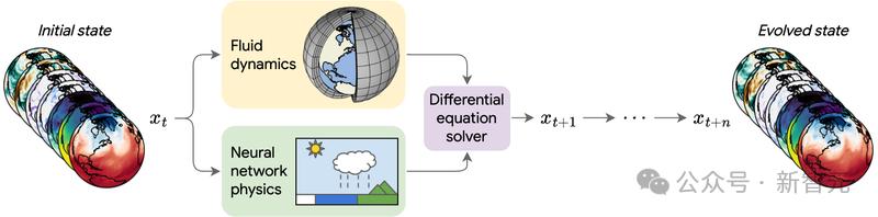 NeuralGCM结合了传统的流体动力学求解器和用于小尺度物理的神经网络,这些组件通过一个微分方程求解器组合在一起,使系统按时间顺序推进